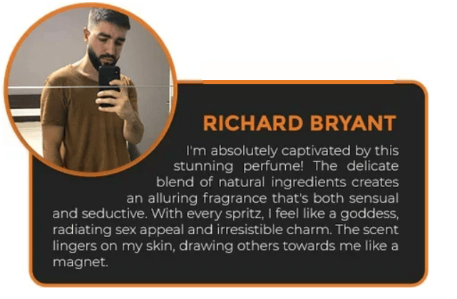 āI'm absolutely captivated by this stunning perfume! The delicate blend of natural ingredients creates an alluring fragrance that's both sensual and seductive. With every spritz, I feel like a goddess, radiating sex appeal and irresistible charm. TheĀ scent lingers on my skin, drawing others towards me like a magnet.Ā The complexity of the fragrance is both enchanting and mysterious, and I can't help but feel an electric attraction when I wear it. If you want to unleash your inner sex goddess, this perfume is an absolute must-have.āĀ - Richard Bryant, Lafayette, LA